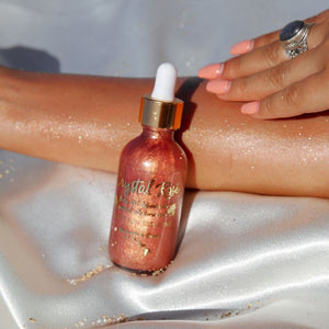 Use our rose scented shimmer oil for a nourishing feel and an all eyes on me look. The infusion of our mica with multicolored rose-gold minerals & golden mica flakes blends into a gorgeous glow & shimmer on the skin. Our natural mix of rose & sandalwood creates an exotic yet floral scent, like you just stepped out of a rose petal bath. Don't blame us if everyone suddenly finds you irresistible.
